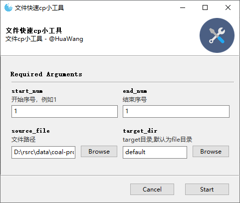 from gooey import Gooey, GooeyParser import shutil import os def copy_files(satrt_num,end_number,source_file,target_dir): # target_dir =os.path.dirname(__file__) for i in range(satrt_num, end_number+1): file_name = "{:>05d}.txt".format(i) if target_dir=="default": target_dir = os.path.dirname(source_file) try: shutil.copy(source_file, fr"{target_dir}\{file_name}") except Exception as e: print("copy{:>05d}.txt失败,reason:".format(i), e) print("恭喜你,复制文件{:>05d}.txt-{:>05d}.txt成功!".format(satrt_num,end_number)) @Gooey(program_name="文件快速cp小工具",encoding='cp936') def main(): base_path = r"D:\rsrc\data\coal-project" parser = GooeyParser(description="文件cp小工具 - @HuaWang") parser.add_argument('start_num', help="开始序号,例如1", default=1) parser.add_argument('end_num', help="结束序号", default=1) parser.add_argument('source_file', help="文件路径", widget="FileChooser",default=base_path) parser.add_argument('target_dir', help="target目录,默认为file目录", widget="DirChooser",default ="default") args = parser.parse_args() #将用户输入的所有文本转化为对应对象的变量值,args.var 可提取对应的变量值 copy_files(int(args.start_num), int(args.end_num),args.source_file,args.target_dir) print("over!!!!!",flush=True) if __name__ == '__main__': main()