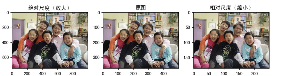 import cv2 as cv # 1. 读取图片 img1 = cv.imread("./image/dog.jpeg") # 2.图像缩放 # 2.1 绝对尺寸 rows,cols = img1.shape[:2] res = cv.resize(img1,(2*cols,2*rows),interpolation=cv.INTER_CUBIC) # 2.2 相对尺寸 res1 = cv.resize(img1,None,fx=0.5,fy=0.5) # 3 图像显示 # 3.1 使用opencv显示图像(不推荐) cv.imshow("orignal",img1) cv.imshow("enlarge",res) cv.imshow("shrink)",res1) cv.waitKey(0) # 3.2 使用matplotlib显示图像 fig,axes=plt.subplots(nrows=1,ncols=3,figsize=(10,8),dpi=100) axes[0].imshow(res[:,:,::-1]) axes[0].set_title("绝对尺度(放大)") axes[1].imshow(img1[:,:,::-1]) axes[1].set_title("原图") axes[2].imshow(res1[:,:,::-1]) axes[2].set_title("相对尺度(缩小)") plt.show()