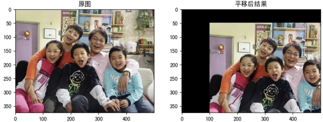 import numpy as np import cv2 as cv import matplotlib.pyplot as plt # 1. 读取图像 img1 = cv.imread("./image/image2.jpg") # 2. 图像平移 rows,cols = img1.shape[:2] M = M = np.float32([[1,0,100],[0,1,50]])# 平移矩阵 dst = cv.warpAffine(img1,M,(cols,rows)) # 3. 图像显示 fig,axes=plt.subplots(nrows=1,ncols=2,figsize=(10,8),dpi=100) axes[0].imshow(img1[:,:,::-1]) axes[0].set_title("原图") axes[1].imshow(dst[:,:,::-1]) axes[1].set_title("平移后结果") plt.show()