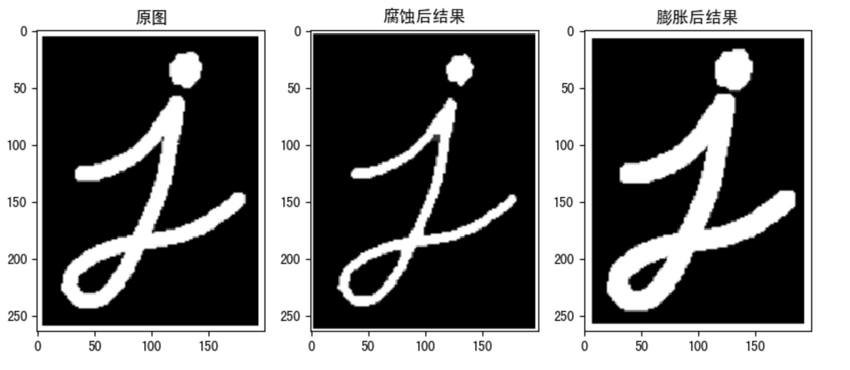 import numpy as np import cv2 as cv import matplotlib.pyplot as plt # 1 读取图像 img = cv.imread("./image/image3.png") # 2 创建核结构 kernel = np.ones((5, 5), np.uint8) # 3 图像腐蚀和膨胀 erosion = cv.erode(img, kernel) # 腐蚀 dilate = cv.dilate(img,kernel) # 膨胀 # 4 图像展示 fig,axes=plt.subplots(nrows=1,ncols=3,figsize=(10,8),dpi=100) axes[0].imshow(img) axes[0].set_title("原图") axes[1].imshow(erosion) axes[1].set_title("腐蚀后结果") axes[2].imshow(dilate) axes[2].set_title("膨胀后结果") plt.show()