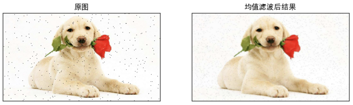 import cv2 as cv import numpy as np from matplotlib import pyplot as plt # 1 图像读取 img = cv.imread('./image/dogsp.jpeg') # 2 均值滤波 blur = cv.blur(img,(5,5)) # 3 图像显示 plt.figure(figsize=(10,8),dpi=100) plt.subplot(121),plt.imshow(img[:,:,::-1]),plt.title('原图') plt.xticks([]), plt.yticks([]) plt.subplot(122),plt.imshow(blur[:,:,::-1]),plt.title('均值滤波后结果') plt.xticks([]), plt.yticks([]) plt.show()