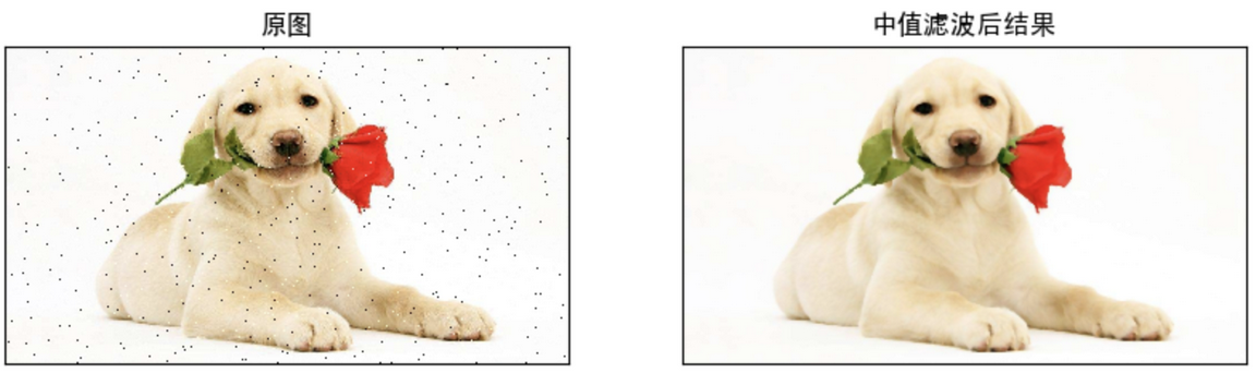 import cv2 as cv import numpy as np from matplotlib import pyplot as plt # 1 图像读取 img = cv.imread('./image/dogsp.jpeg') # 2 中值滤波 blur = cv.medianBlur(img,5) # 3 图像展示 plt.figure(figsize=(10,8),dpi=100) plt.subplot(121),plt.imshow(img[:,:,::-1]),plt.title('原图') plt.xticks([]), plt.yticks([]) plt.subplot(122),plt.imshow(blur[:,:,::-1]),plt.title('中值滤波后结果') plt.xticks([]), plt.yticks([]) plt.show()