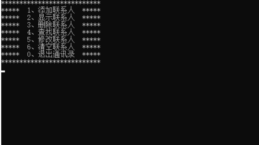 #include<iostream> using namespace std; //菜单界面 void showMenu() { cout << "***************************" << endl; cout << "***** 1、添加联系人 *****" << endl; cout << "***** 2、显示联系人 *****" << endl; cout << "***** 3、删除联系人 *****" << endl; cout << "***** 4、查找联系人 *****" << endl; cout << "***** 5、修改联系人 *****" << endl; cout << "***** 6、清空联系人 *****" << endl; cout << "***** 0、退出通讯录 *****" << endl; cout << "***************************" << endl; } int main() { showMenu(); system("pause"); return 0; }