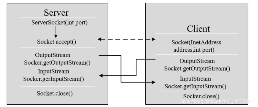 打开连接到 Socket 的输入/出流: 使用 getInputStream()方法获得输入流,使用 getOutputStream()方法获得输出流,进行数据传输