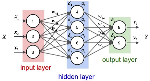 如上图,输入层有三个节点,我们将其依次编号为1、2、3;隐藏层的4个节点,编号依次为4、5、6、7;最后输出层的两个节点编号为8、9。因为我们这个神经网络是全连接网络,所以可以看到每个节点都和上一层的所有节点有连接。比如,我们可以看到隐藏层的节点4,它和输入层的三个节点1、2、3之间都有连接,其连接上的权重分别为\(w_{41},w_{42},w_{42}\),然后\(a_{4}\)是这个节点4的输出值,也就是后面8,9节点的输入值。
