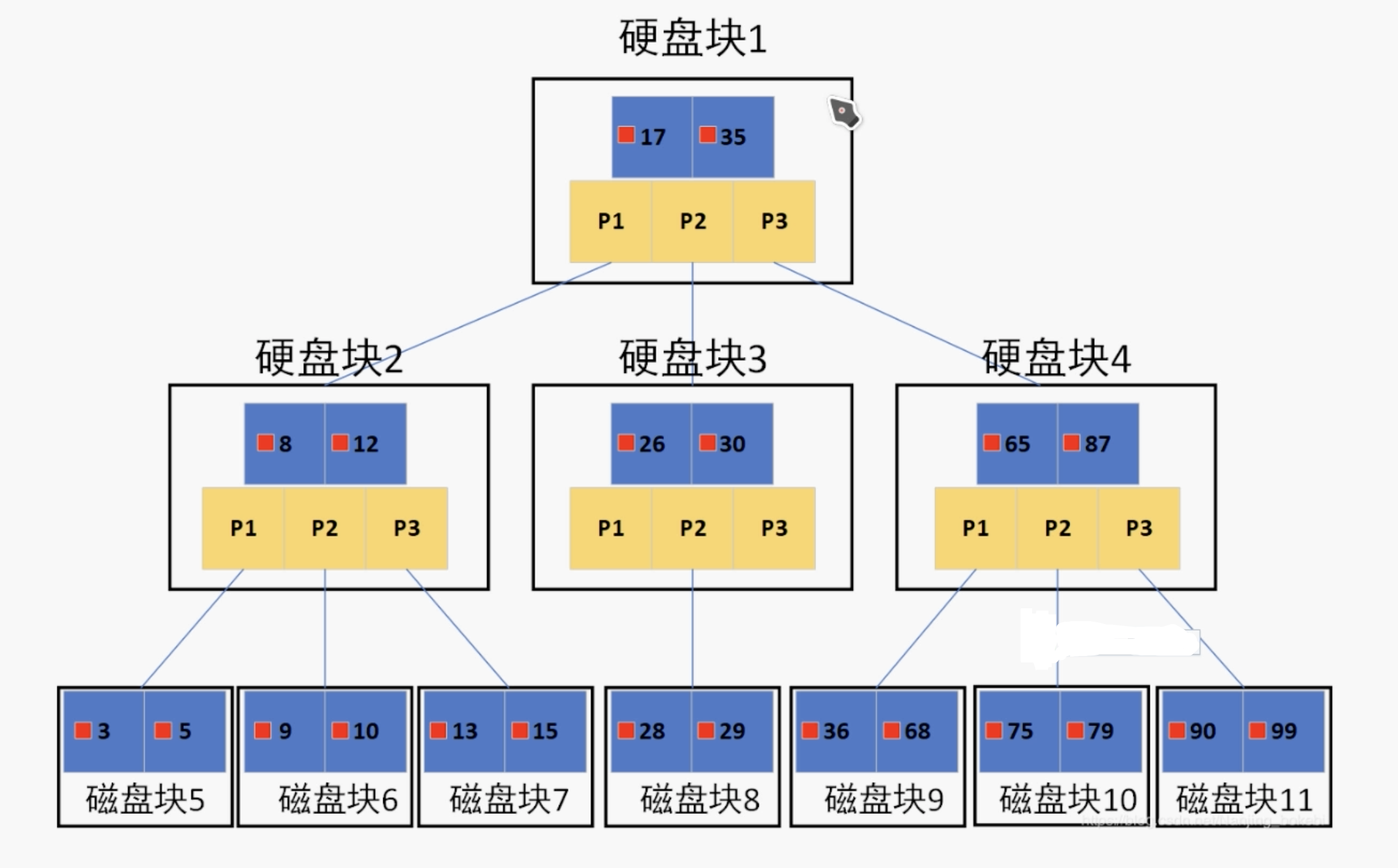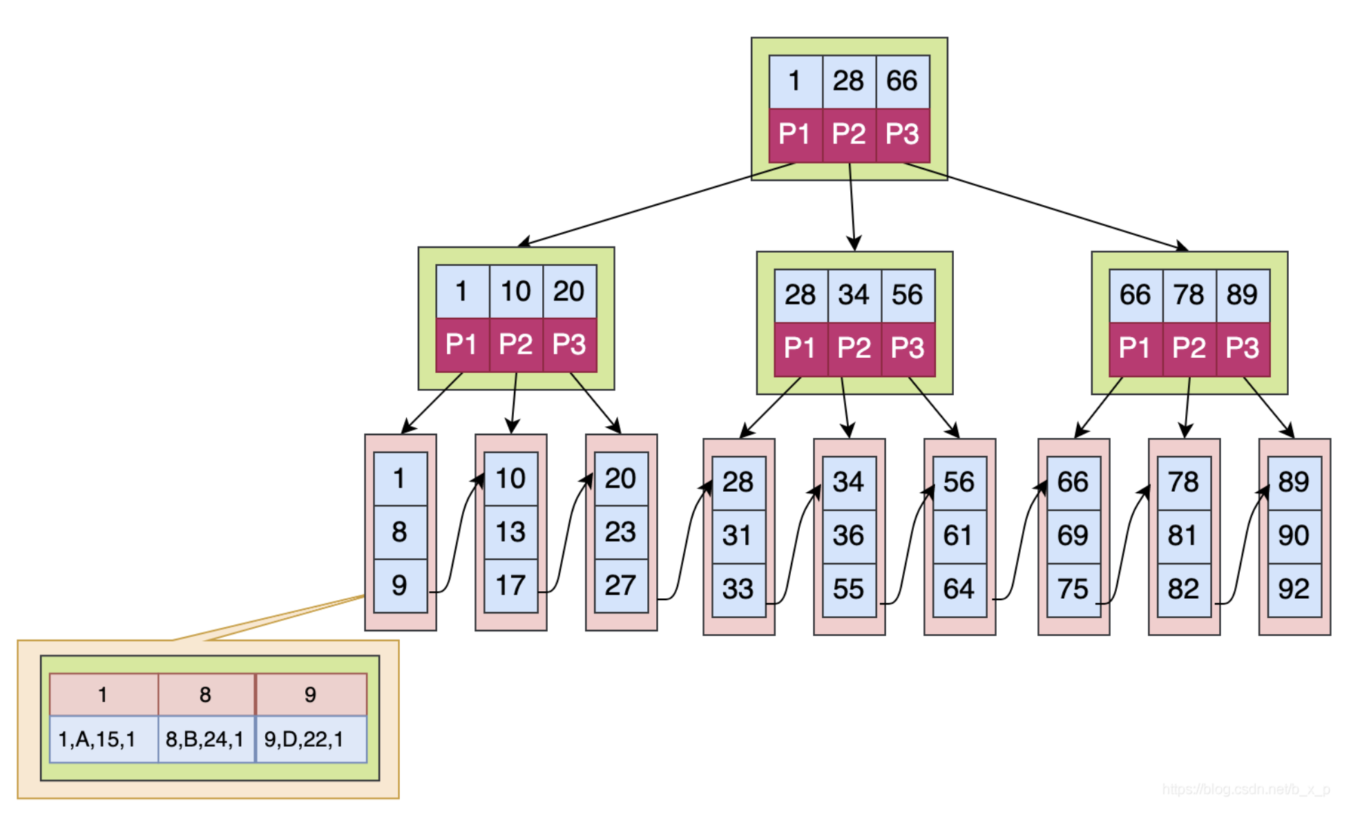 如果上图中是用ID做的索引,如果是搜索X = 1的数据,搜索规则如下: 1.取出根磁盘块,加载1,28,66三个关键字。 2.X <= 1 走P1,取出磁盘块,加载1,10,20三个关键字。 3.X <= 1 走P1,取出磁盘块,加载1,8,9三个关键字。 4.已经到达叶子节点,命中1,接下来加载对应的数据,图中数据区中存储的是具体的数据。