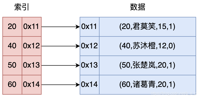 索引是为了加速对表中数据行的检索而创建的一种分散存储的数据结构。其工作机制如图: 图中,如果现在有一条sql语句 select * from user where id = 40,如果没有索引的条件下,我们要找到这条记录,我们就需要在数据中进行全表扫描,匹配id = 13的数据。 如果有了索引,我们就可以通过索引进行快速查找,如上图中,可以先在索引中通过id = 40进行二分查找,再根据定位到的地址取出对应的行数据。