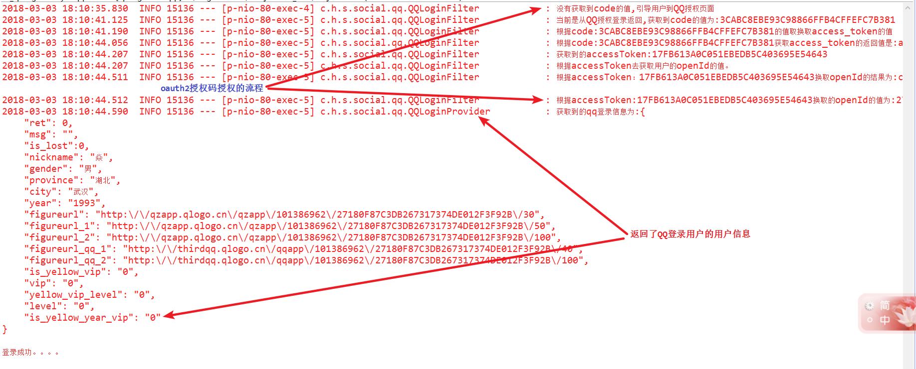 说明用户同意了授权,即用户使用QQ登录了,那么此时就可以进行下一步操作,获取access_token,即令牌。然后再获取用户的openId的值,因为在获取用户的QQ基本信息时需要用到用户的openId.有了这些参数,然后就可以交给spring security的认证管理器去认证