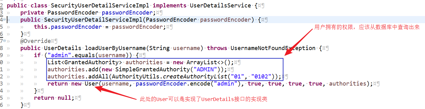 |- SecurityUserDetailServiceImpl#loadUserByUsername(String) 在根据用户名获取到用户后,一起查询出用户拥有的权限