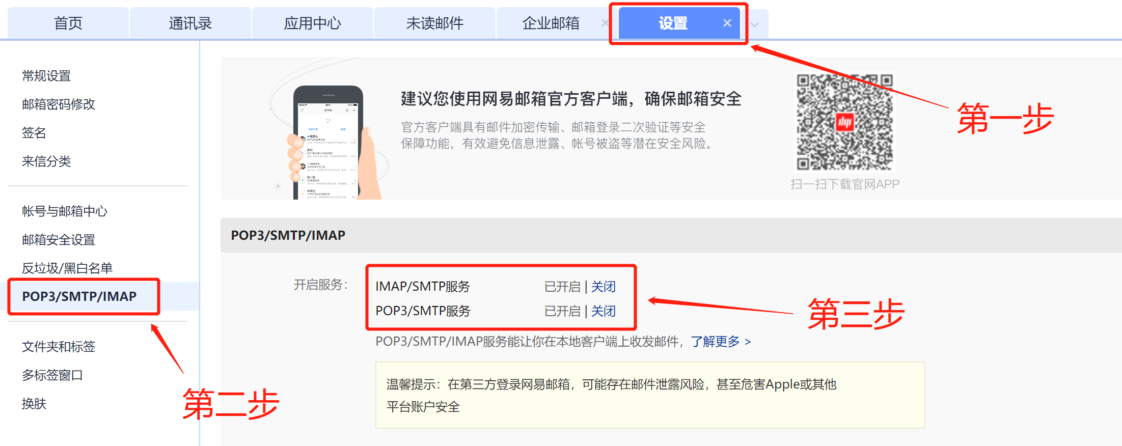 这里我用的网易邮箱,其它邮箱类似步骤,不清楚的可以百度。