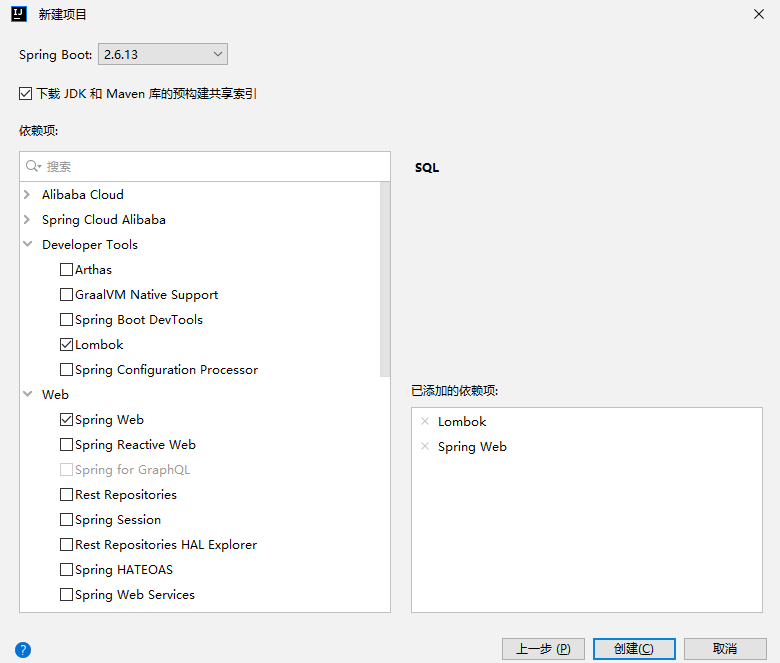 版本默认,这里我只勾选了两个依赖,其它的后面补上。