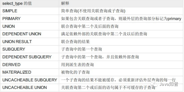 我们重点需要关注select_type、type、possible_keys、key、Extra这些列,我们来一一说明,看到select_type列,这里是SIMPLE简单查询,其他值下面给大家列出。