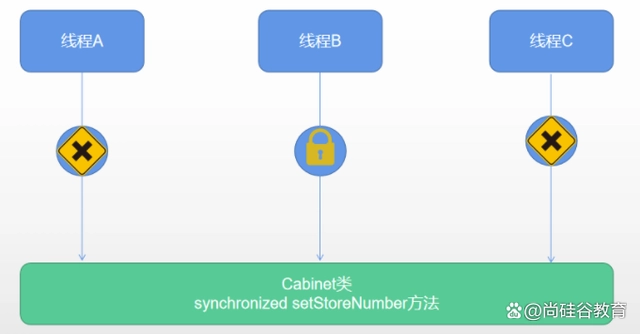 如上图所示,线程A,线程B,线程C同时调用Cabinet类的setStoreNumber方法,线程B获得了锁,所以线程B可以执行setStore的方法,线程A和线程C只能等待。