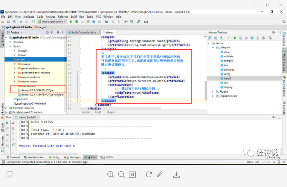 1 <!-- 2 在工作中,很多情况下我们打包是不想执行测试用例的 3 可能是测试用例不完事,或是测试用例会影响数据库数据 4 跳过测试用例执 5 --> 6 <plugin> 7 <groupId>org.apache.maven.plugins</groupId> 8 <artifactId>maven-surefire-plugin</artifactId> 9 <configuration> 10 <!--跳过项目运行测试用例--> 11 <skipTests>true</skipTests> 12 </configuration> 13 </plugin>
