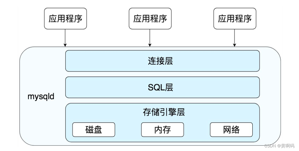 我们所看到的的MySQL是由三个层组成的,分别如下: