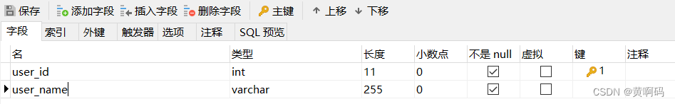 如上,我们创建了一个叫做user_info的表, 里面有两个字段,一个是 user_id ,它是 int 类型,另一个 user_name 字段是varchar(255)类型。这两个字段都不为空,且 user_id 是递增的,而其中的not null表示非空,切记语句最后要加;【千万要记住】AUTO_INCREMENT代表主键自动增长。有刚入门的同学说什么是主键?>>文章后边我会单纯讲述,别着急。