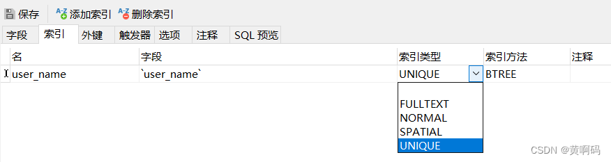 我们还可对user_name字段进行索引,索引类型为Unique。使用 Navicat 设置如下: