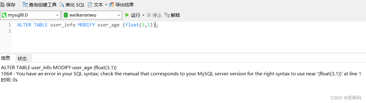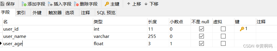 3、修改字段的数据类型,将user_age的数据类型设置为float(3,1)