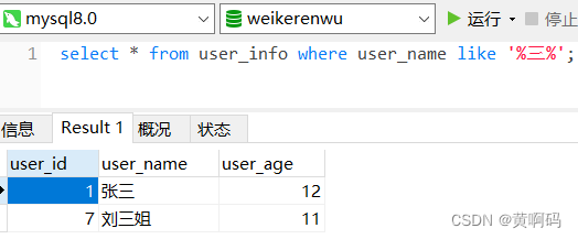 如果我们想要匹配任意字符串出现的任意次数,需要使用(%)通配符。比如我们想要查找user_name中包含“三”字的数据都有哪些: