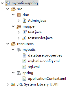<?xml version="1.0" encoding="UTF-8"?> <beans xmlns="http://www.springframework.org/schema/beans" xmlns:xsi="http://www.w3.org/2001/XMLSchema-instance" xmlns:mvc="http://www.springframework.org/schema/mvc" xmlns:context="http://www.springframework.org/schema/context" xmlns:aop="http://www.springframework.org/schema/aop" xmlns:tx="http://www.springframework.org/schema/tx" xsi:schemaLocation="http://www.springframework.org/schema/beans http://www.springframework.org/schema/beans/spring-beans.xsd http://www.springframework.org/schema/mvc http://www.springframework.org/schema/mvc/spring-mvc.xsd http://www.springframework.org/schema/context http://www.springframework.org/schema/context/spring-context.xsd http://www.springframework.org/schema/aop http://www.springframework.org/schema/aop/spring-aop.xsd"> <!-- 外部连接properties文件 --> <context:property-placeholder location="classpath:mybatis/database.properties"/> <!-- 配置数据库连接池 --> <bean id="datasource" class="com.mchange.v2.c3p0.DriverManagerDataSource"> <property name="driverClass" value="${jdbc.driver}" /> <property name="jdbcUrl" value="${jdbc.url}" /> <property name="user" value="${jdbc.username}" /> <property name="password" value="${jdbc.password}"/> </bean> <!-- 配置SqlSession工厂 --> <bean name="SqlSessionFactoryBean" class="org.mybatis.spring.SqlSessionFactoryBean"> <property name="dataSource" ref="datasource"></property> <property name="configLocation" value="classpath:mybatis/mybatis-config.xml"></property> </bean> <!-- 配置mapper动态代理 --> <bean class="org.mybatis.spring.mapper.MapperScannerConfigurer"> <property name="basePackage" value="mapper"></property> </bean> </beans>