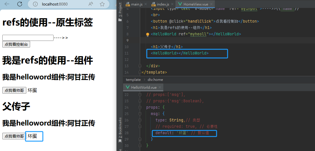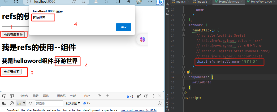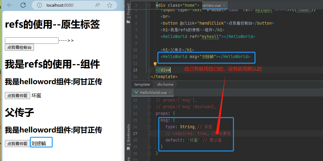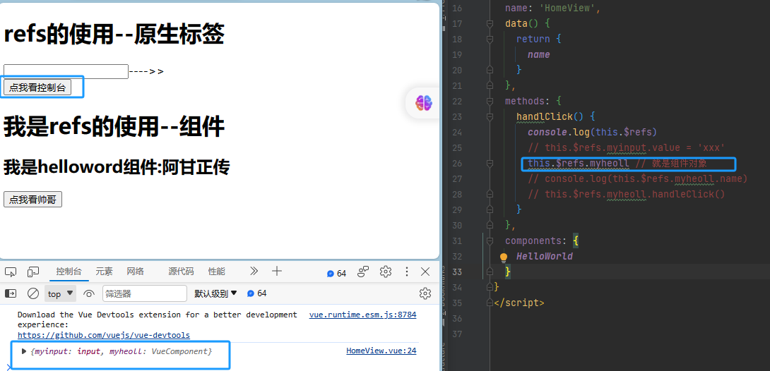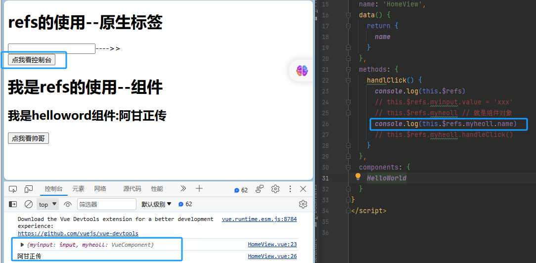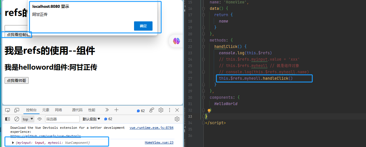 -放在组件上,通过该this.$refs.名字---》取到的是组件对象,这样在父组件中,就拿到了子组件对象,对象属性和方法直接用即可