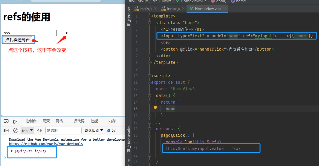 -放在普通标签上,通过 this.$refs.名字---》取到的是dom对象,可以直接操作dom