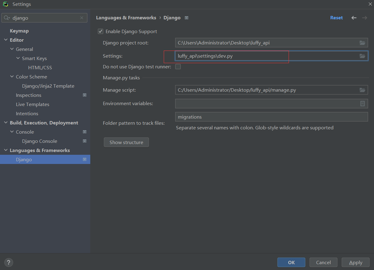 - 修改manage.py 中 os.environ.setdefault('DJANGO_SETTINGS_MODULE', 'luffy_api.settings.dev')