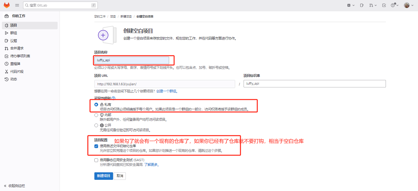无论你选择哪种方式,都需要填写必填项,并设置项目的可见性(公共或私有)。