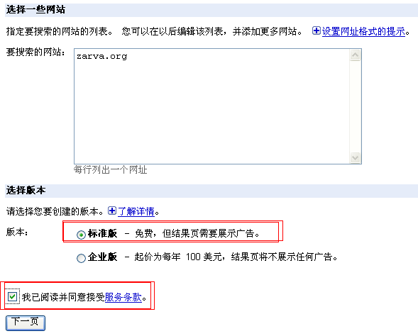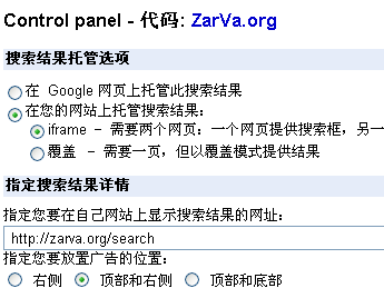 选择搜索结果托管选项.....选择"在您的网站上托管搜索结果:iframe".在"显示搜索结果的网址"处填写http://zarva.org/search,这个网址就是显示搜索结果的.呆会我们需要用到的..."广告的位置",任选....