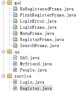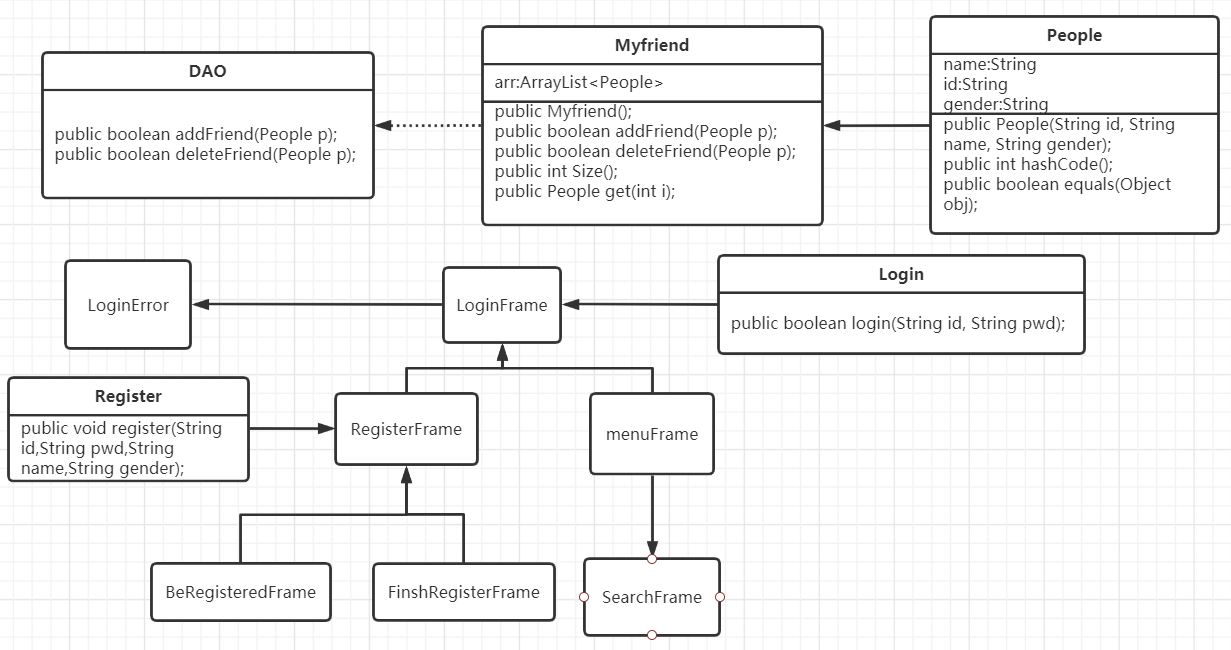 主要的类是 Myfriend 和People,Myfriend 用到了ArrayList用于存储People信息,Myfriend里的方法是添加People到Myfriend里,或者删除People从Myfriend。People类中有name、id、gener三个属性,方法是他们各自的set/get和public People(String id,String name,String gender); 使用ArrayList的原因是因为存储People的信息到列表里,然后依次遍历查询就可以了。