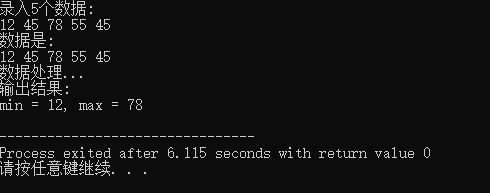 #include <stdio.h> #define N 5 void input(int x[], int n); void output(int x[], int n); void find_min_max(int x[], int n, int *pmin, int *pmax); int main() { int a[N]; int min, max; printf("录入%d个数据:\n", N); input(a, N); printf("数据是: \n"); output(a, N); printf("数据处理...\n"); find_min_max(a, N, &min, &max); printf("输出结果:\n"); printf("min = %d, max = %d\n", min, max); return 0; } void input(int x[], int n) { int i; for(i = 0; i < n; ++i) scanf("%d", &x[i]); } void output(int x[], int n) { int i; for(i = 0; i < n; ++i) printf("%d ", x[i]); printf("\n"); } void find_min_max(int x[], int n, int *pmin, int *pmax) { int i; *pmin = *pmax = x[0]; for(i = 1; i < n; ++i) if(x[i] < *pmin) *pmin = x[i]; else if(x[i] > *pmax) *pmax = x[i]; }