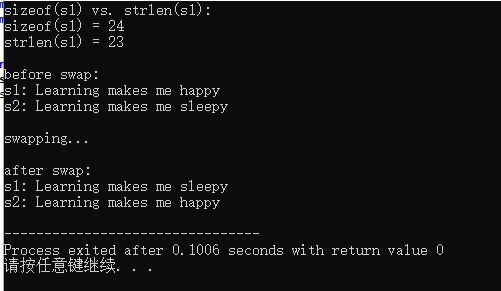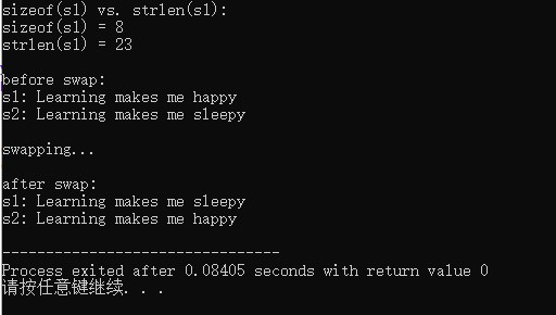 #include <stdio.h> #include <string.h> #define N 80 int main() { char *s1 = "Learning makes me happy"; char *s2 = "Learning makes me sleepy"; char *tmp; printf("sizeof(s1) vs. strlen(s1): \n"); printf("sizeof(s1) = %d\n", sizeof(s1)); printf("strlen(s1) = %d\n", strlen(s1)); printf("\nbefore swap: \n"); printf("s1: %s\n", s1); printf("s2: %s\n", s2); printf("\nswapping...\n"); tmp = s1; s1 = s2; s2 = tmp; printf("\nafter swap: \n"); printf("s1: %s\n", s1); printf("s2: %s\n", s2); return 0; }