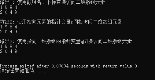 #include <stdio.h> #include <stdio.h> int main() { int x[2][4] = {{1, 9, 8, 4}, {2, 0, 4, 9}}; int i, j; int *ptr1; // 指针变量,存放int类型数据的地址 int(*ptr2)[4]; // 指针变量,指向包含4个int元素的一维数组 printf("输出1: 使用数组名、下标直接访问二维数组元素\n"); for (i = 0; i < 2; ++i) { for (j = 0; j < 4; ++j) printf("%d ", x[i][j]); printf("\n"); } printf("\n输出2: 使用指向元素的指针变量p间接访问二维数组元素\n"); for (ptr1 = &x[0][0], i = 0; ptr1 < &x[0][0] + 8; ++ptr1, ++i) { printf("%d ", *ptr1); if ((i + 1) % 4 == 0) printf("\n"); } printf("\n输出3: 使用指向一维数组的指针变量q间接访问二维数组元素\n"); for (ptr2 = x; ptr2 < x + 2; ++ptr2) { for (j = 0; j < 4; ++j) printf("%d ", *(*ptr2 + j)); printf("\n"); } return 0; }