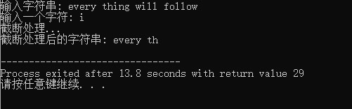 #include <stdio.h> #define N 80 void str_trunc(char *str, char x); int main() { char str[N]; char ch; printf("输入字符串: "); gets(str); printf("输入一个字符: "); ch = getchar(); printf("截断处理...\n"); str_trunc(str, ch); printf("截断处理后的字符串: %s\n", str); } void str_trunc(char *str, char x) { while(*str) { if(*str == x) *str='\0'; str++; } }