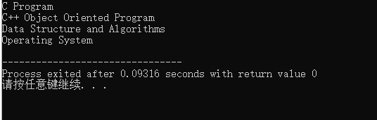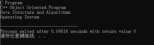 #include <stdio.h> #include <string.h> void sort(char *name[], int n); int main() { char *course[4] = {"C Program", "C++ Object Oriented Program", "Operating System", "Data Structure and Algorithms"}; int i; sort(course, 4); for (i = 0; i < 4; i++) printf("%s\n", course[i]); return 0; } void sort(char *name[], int n) { int i, j, k; char *tmp; for (i = 0; i < n - 1; i++) { k = i; for (j = i + 1; j < n; j++) if (strcmp(name[j], name[k]) < 0) k = j; if (k != i) { tmp = name[i]; name[i] = name[k]; name[k] = tmp; } } }