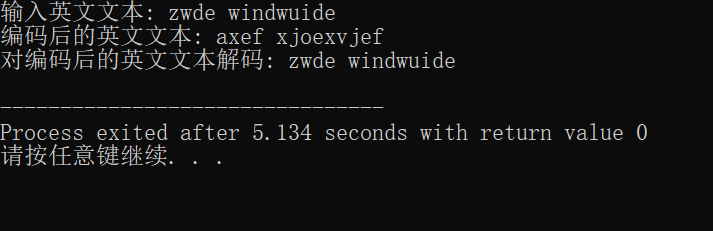 #include <stdio.h> #define N 80 void encoder(char *str); // 函数声明 void decoder(char *str); // 函数声明 int main() { char words[N]; printf("输入英文文本: "); gets(words); printf("编码后的英文文本: "); encoder(words); // 函数调用 printf("%s\n", words); printf("对编码后的英文文本解码: "); decoder(words); // 函数调用 printf("%s\n", words); return 0; } /*函数定义 功能:对s指向的字符串进行编码处理 编码规则: 对于a~z或A~Z之间的字母字符,用其后的字符替换; 其中,z用a替换,Z用A替换 其它非字母字符,保持不变 */ void encoder(char *str) { int i=0; while(str[i]!='\0'){ if(str[i]!=90&&str[i]!=122&&str[i]!=' '){ str[i]=str[i]+1; } else if(str[i]==90||str[i]==122) { str[i]=str[i]-25; } else if(str[i]==' '){ str[i]=str[i]; } i++; } } /*函数定义 功能:对s指向的字符串进行解码处理 解码规则: 对于a~z或A~Z之间的字母字符,用其前面的字符替换; 其中,a用z替换,A用Z替换 其它非字母字符,保持不变 */ void decoder(char *str) { int i=0; while(str[i]!='\0'){ if(str[i]!=65&&str[i]!=97){ str[i]=str[i]-1; } else { str[i]=str[i]+25; } i++; } }