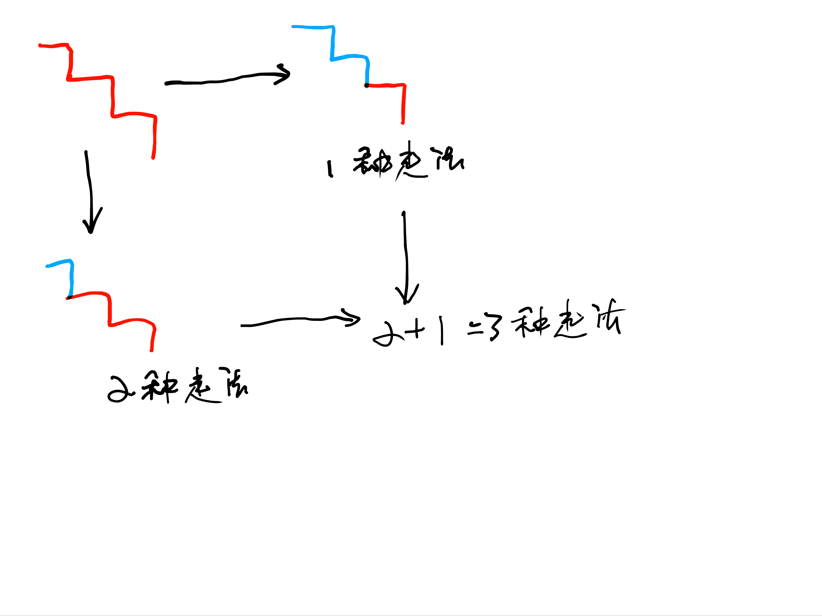 后两次 情况是最后一步跨了两个台阶,前走的两阶走法是不是和两阶走法一样,然后加上两阶