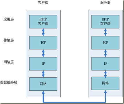 互联网内各网络设备间的通信都遵循TCP/IP协议,利用TCP/IP协议族进行网络通信时,会通过分层顺序与对方进行通信。分层由高到低分别为:应用层、传输层、网络层、数据链路层。发送端从应用层往下走,接收端从数据链路层网上走。如图所示:
