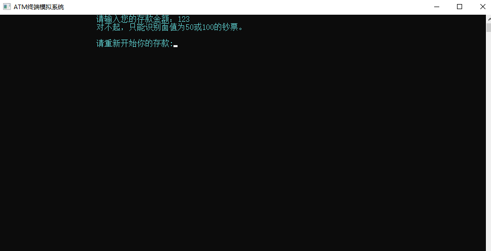 printf("对不起,只能识别面值为50或100的钞票。\n\n\t\t\t请重新开始你的存款:");}