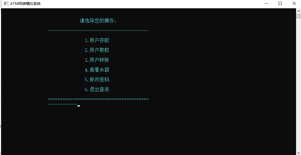 1.实现了ATM基本的功能输入密码登录,查询余额,转账,修改密码,取款和存款。相比ATM机的功能,在取款,存款,转账金额方面应该给用户一个选择金额的功能和金额的限制!
