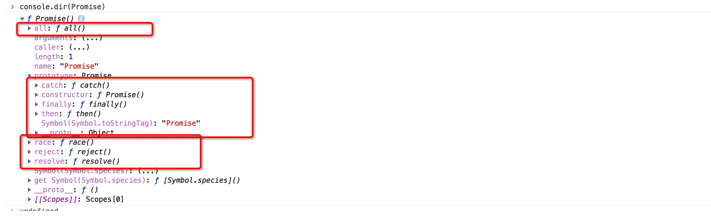 可以看到上面的Promise自身有我们常用的all、race、resoleve、reject等方法,原型中还有catch、then等方法,所以我们创建Promise实例时,将then会作为callback使用,避免回调地狱的出现。