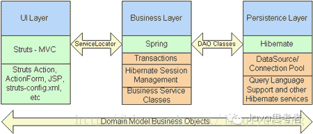 SSH框架系统从职责上分为四层:表示层、业务逻辑层、数据持久层和域模块层(实体层)。