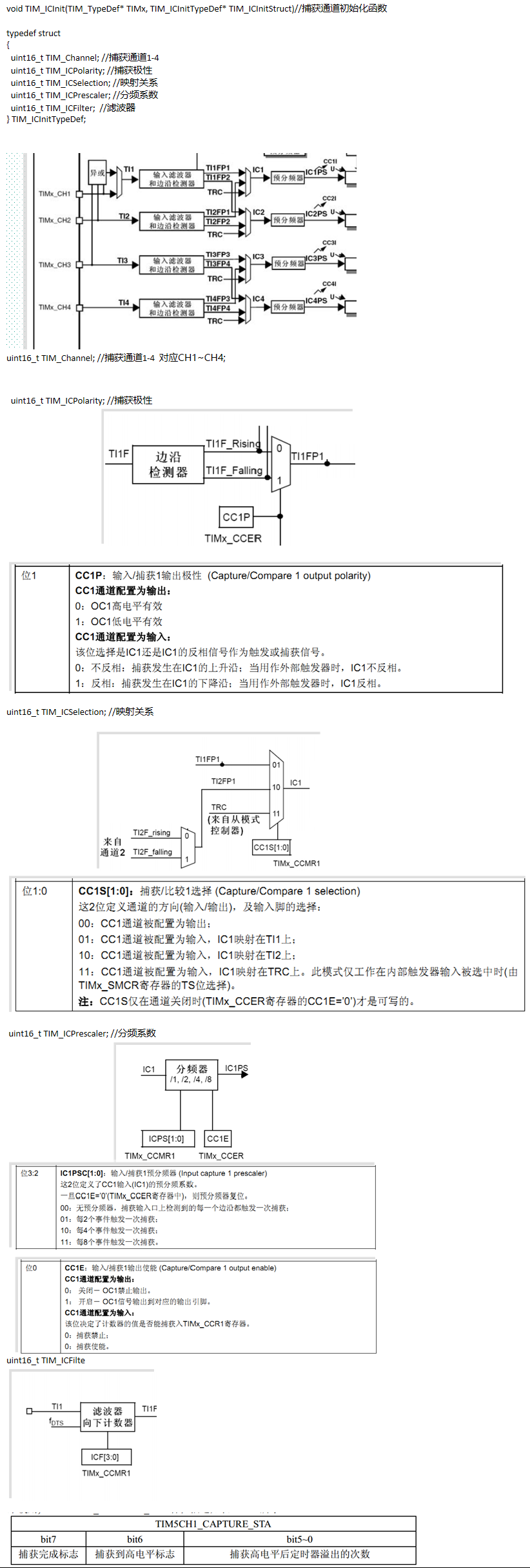 1 Timer.h 2 #ifndef __TIMER_H 3 #define __TIMER_H 4 #include "sys.h" 5 6 void TIM5_Cap_Init(u16 arr,u16 psc); 7 #endif 8 9 10 11 Timer.c 12 13 void TIM5_Cap_Init(u16 arr,u16 psc) 14 { 15 //使能TIM5时钟 16 RCC_APB1PeriphClockCmd(RCC_APB1Periph_TIM5, ENABLE)RCC_APB2PeriphClockCmd(RCC_APB2Periph_GPIOA, ENABLE); 17 GPIO_ResetBits(GPIOA,GPIO_Pin_0); //初始化PA0 配置成下拉输入 18 TIM_TimeBaseInit(TIM5, &TIM_TimeBaseStructure);//初始化TIM5定时器 19 TIM_ICInit(TIM5, &TIM5_ICInitStructure);//初始化TIM5输入捕获 20 TIM_ITConfig(TIM5,TIM_IT_Update|TIM_IT_CC1,ENABLE);//允许更新中断 ,允许CC1IE捕获中断 21 TIM_Cmd(TIM5,ENABLE ); //使能定时 22 } 23 u8 TIM5CH1_CAPTURE_STA=0; //输入捕获状态 24 u16 TIM5CH1_CAPTURE_VAL; //输入捕获值 25 void TIM5_IRQHandler(void) 26 { 27 if((TIM5CH1_CAPTURE_STA&0x80)==0) //未捕获到 28 { 29 if(TIM_GetITStatus(TIM5,TIM_IT_Update)!=RESET)//触发更新中断,持续高电平检测 30 { 31 if(TIM5CH1_CAPTURE_STA&0x40)//高电平 32 { 33 if((TIM5CH1_CAPTURE_STA&0x3F)==0x3F)//如果定时器溢出次数达到65535 34 { 35 TIM5CH1_CAPTURE_STA|=0x80;//强制捕获完成 36 TIM5CH1_CAPTURE_VAL=0xFFFF;//填满定时器溢出次数位 37 }else TIM5CH1_CAPTURE_STA++; 38 } 39 } 40 if(TIM_GetITStatus(TIM5, TIM_IT_CC1) != RESET)//上升沿 41 { 42 if(TIM5CH1_CAPTURE_STA&0x40)//捕获到上升沿 43 { 44 TIM5CH1_CAPTURE_STA|=0X80; //标记成功捕获到一次高电平脉宽 45 TIM5CH1_CAPTURE_VAL=TIM_GetCapture1(TIM5);//通道捕获值 46 TIM_OC1PolarityConfig(TIM5,TIM_ICPolarity_Rising); //CC1P=0 设置为上升沿捕获 通道极性设置独立函数: 47 } 48 else //还未开始,第一次捕获上升沿 49 { 50 TIM5CH1_CAPTURE_STA=0; //清空 51 TIM5CH1_CAPTURE_VAL=0; 52 TIM_SetCounter(TIM5,0);//获取高电平持续时间 53 TIM5CH1_CAPTURE_STA|=0X40; //标记捕获到了上升沿 54 TIM_OC1PolarityConfig(TIM5,TIM_ICPolarity_Falling); //CC1P=1 设置为下降沿捕获 55 } 56 } 57 58 }TIM_ClearITPendingBit(TIM5, TIM_IT_CC1|TIM_IT_Update); //清除中断标志位 59 } 60 61 Main.c 62 #include "delay.h" 63 #include "key.h" 64 #include "sys.h" 65 #include "usart.h" 66 #include "timer.h" 67 68 69 extern u8 TIM5CH1_CAPTURE_STA; //输入捕获状态 70 extern u16 TIM5CH1_CAPTURE_VAL; //输入捕获值 71 int main(void) 72 { 73 u32 temp=0; 74 delay_init(); //延时函数初始化 75 NVIC_PriorityGroupConfig(NVIC_PriorityGroup_2); //设置NVIC中断分组2:2位抢占优先级,2位响应优先级 76 uart_init(115200); //串口初始化为115200 77 78 TIM5_Cap_Init(0XFFFF,72-1); //以1Mhz的频率计数 //记1个数为1us 定时器的溢出时间为:65536us 79 while(1) 80 { 81 delay_ms(10); 82 if(TIM5CH1_CAPTURE_STA&0X80)//成功捕获到了一次上升沿 83 { 84 temp=TIM5CH1_CAPTURE_STA&0X3F;//得到定时器溢出次数 85 temp*=65536;//溢出时间总和,定时器溢出次数乘以定时器的自动装载值 86 temp+=TIM5CH1_CAPTURE_VAL;//得到总的高电平时间,加上定时器未溢出的1次捕获值 87 printf("HIGH:%d us\r\n",temp);//打印总的高点平时间 88 TIM5CH1_CAPTURE_STA=0;//开启下一次捕获 89 } 90 } 91 } 92