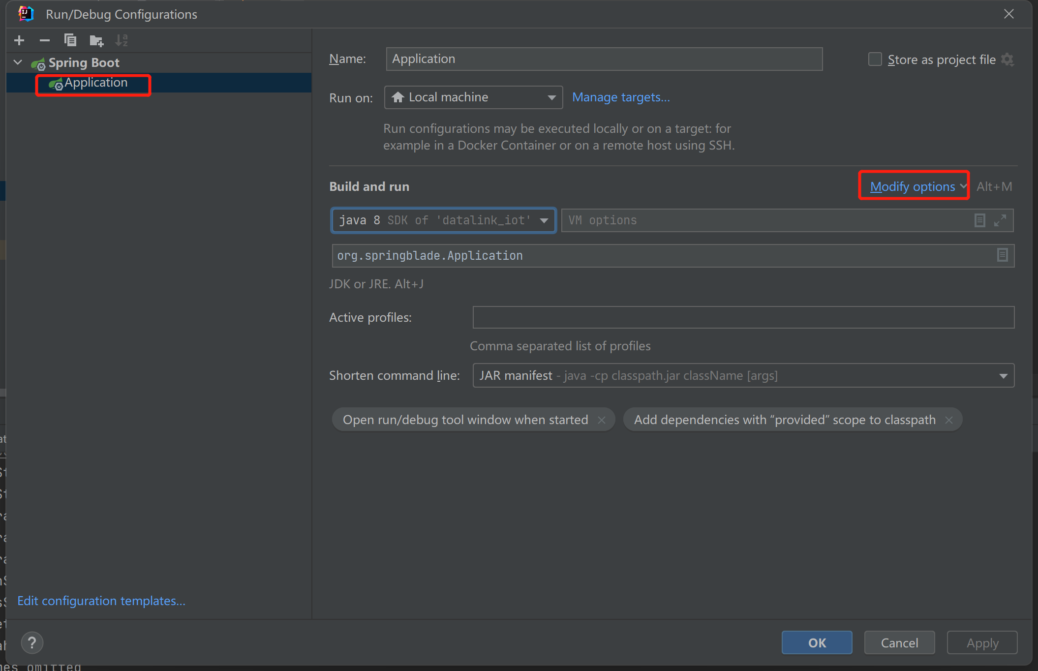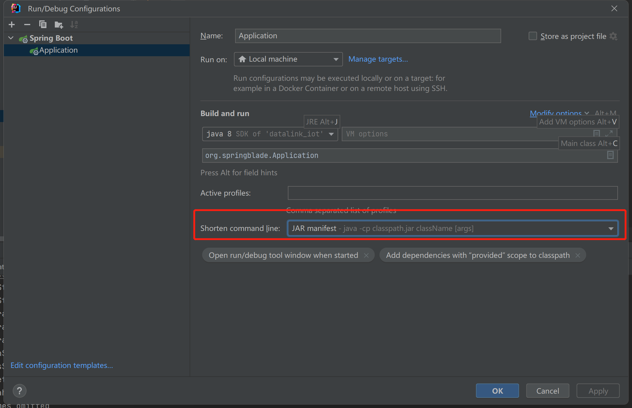 - Shorten command line选择“JAR manifest”,点击“Apply”生效即可