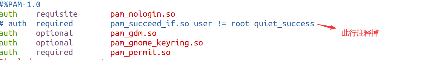 执行sudo vim /etc/pam.d/gdm-password注释掉 auth required pam_succeed_if.so user != root quiet_success这一行(第三行左右)