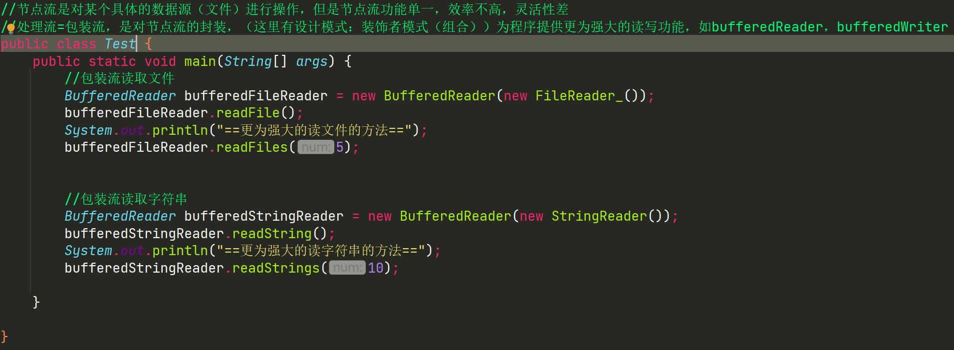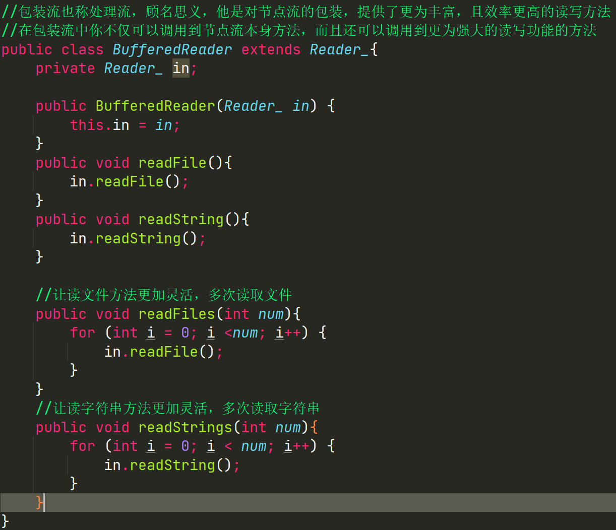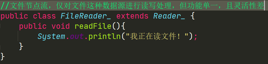 如上图所示,BufferedReader_不仅可以调用FileReader_自己的方法,也可以调用根据传进来FileReader_后,进行设计更为高效的方法。
