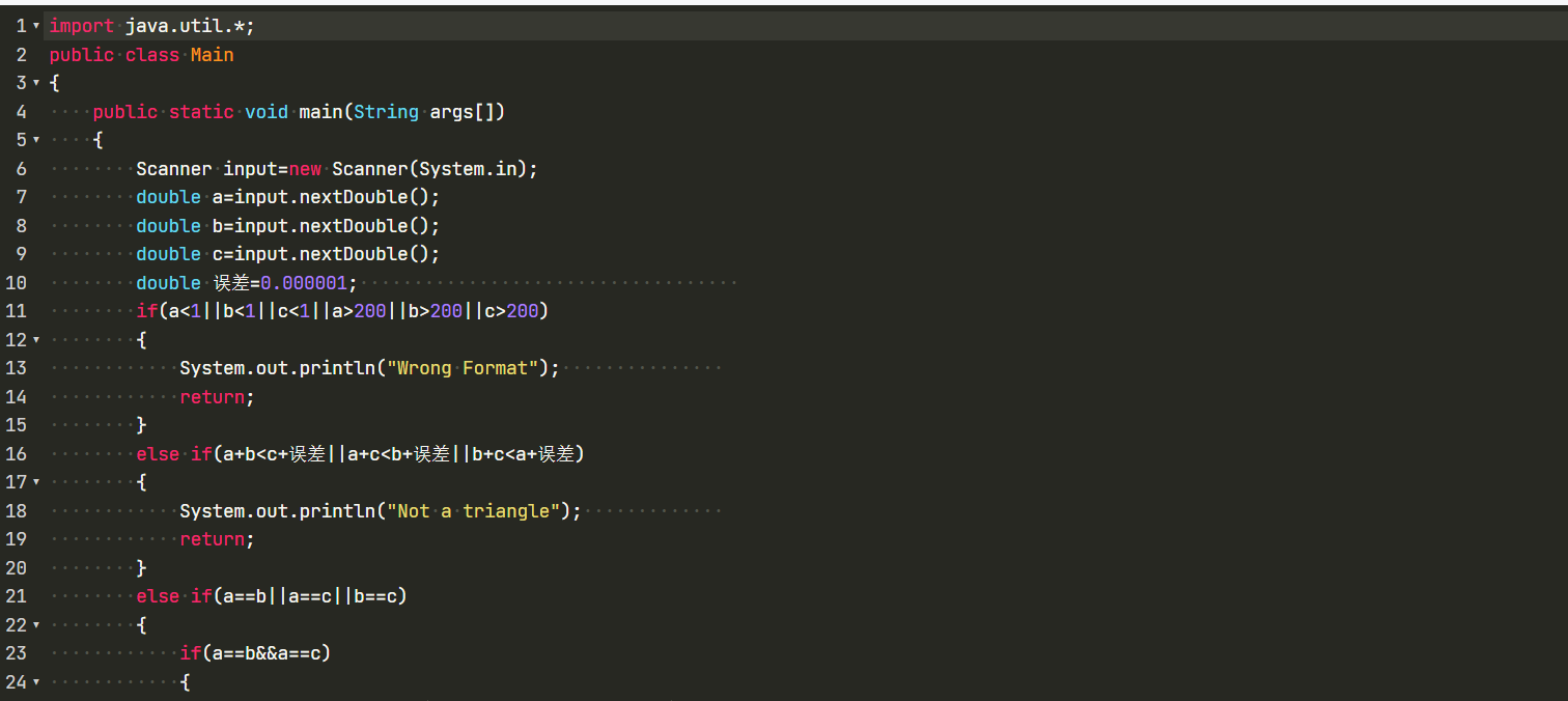 踩坑心得:本体通过三边的长度来判断三角形的类型,极为重要的是里面要对误差进行判断,如果比较长度时没有比较误差,编译通过但是测试点过不了,题目拿不到多少分,误差为0.000001。