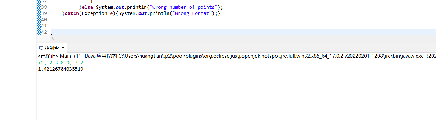 代码分析先通过if对输入数据进行合法性校验输入格式有误直接跳出,通过split方法对输入数据进行处理去除数据当中的空格和逗号再用二维数组储存分隔后的数据,初始化数组nums来储存输入数据当中提取出来的每个点横纵坐标的数值,通过try catch结构运行代码,通过parseDouble方法将输入的字符串当中的数据提取转换成double型数据方便之后对数据进行运算,try后大括号当中运行出错会直接跳到catch后面,parseDouble提取失败则表示输入非法直接输出"Wrong Format",运用math方法对数据进行计算最后输出两点间距离。实现题目要求。