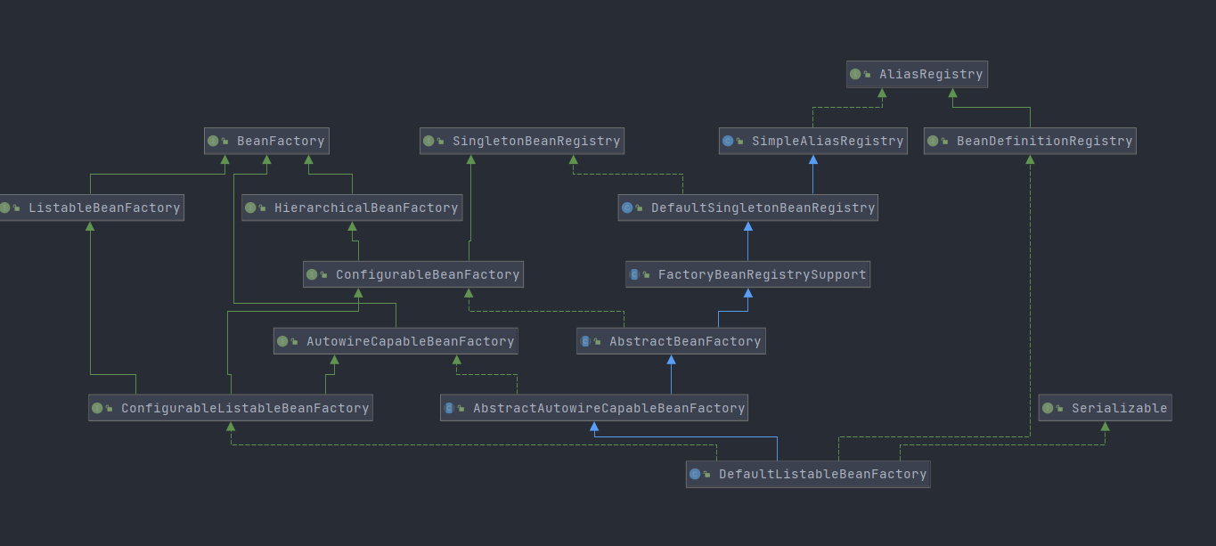 DefaultListableBeanFactory实现了对bean 的全面管理,bean的依赖关系,生命周期等都在这里实现。