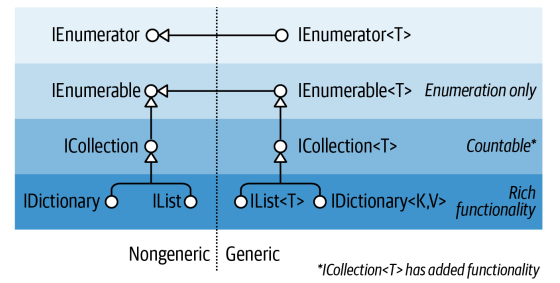 虽然enumeration接口提供对集合向前迭代的协议,但是它们没有提供检测集合大小、通过索引访问成员、查询或者修改集合的机制。所以.NET 定义了ICollection, IList,IDictionary接口。